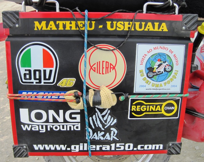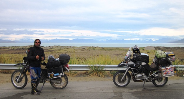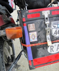 Pablo discovered that the ripio the day before had split his pannier, breaking the rivets and the spot welds that held it together… He use a strip of duct tape and a few bungi cords to hold the ensemble together until we got to Calafate…