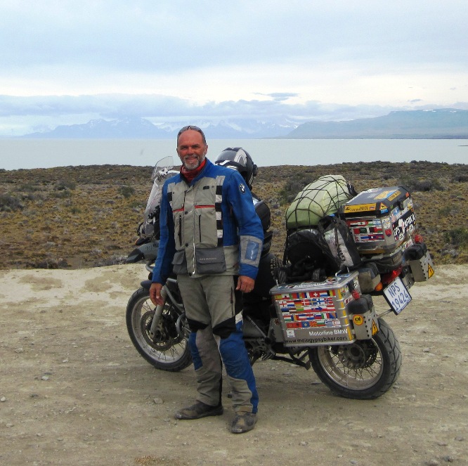 Despite the good conditions, we still stuck to our original plans to ride for about 60 km before taking a break… Our first stop was on the shores of Lago Viedma… A solid layer of cloud overhead made the usually turquoise waters appear gray and leaden…