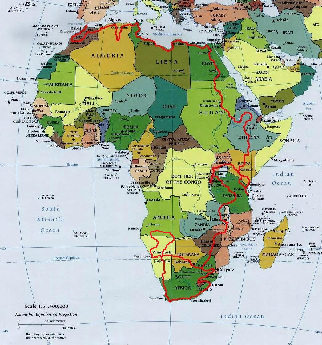The route I have chosen will probably change as the journey unfolds before me… There may be places that become too dangerous to visit, or adverse weather might prevent me from following my chosen route… As I write this (April 6th 2010), things have already changed… I was unable to ride north into Angola as planned, and now I might not be able to ride into Zambia either, due to time constraints… But that is how it will go at times… I have already ridden in these countries, so it won’t be a train smash….