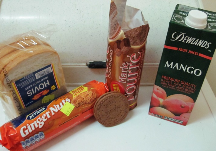 Prices of food here will get your eyes watering...!! A packet of bread, all six slices of it, R14.25... Packet of Ginger Biscuits, R 23.00... Litre of juice, R34.00...!! Check out the Double Chocolate Marie Biscuits...!! Doesn't matter what they cost...!!